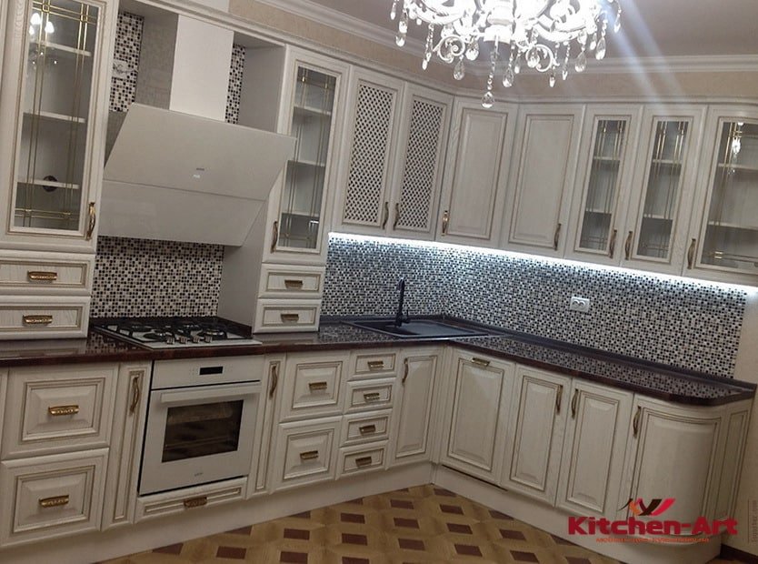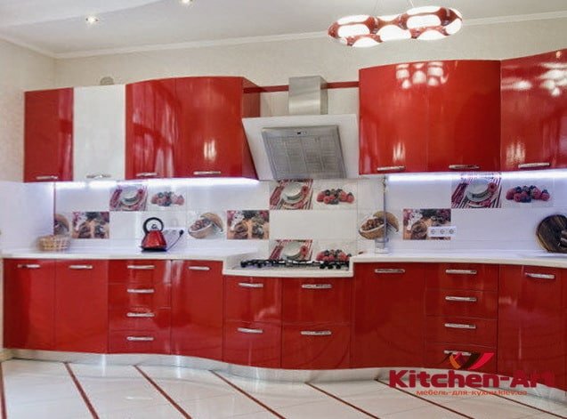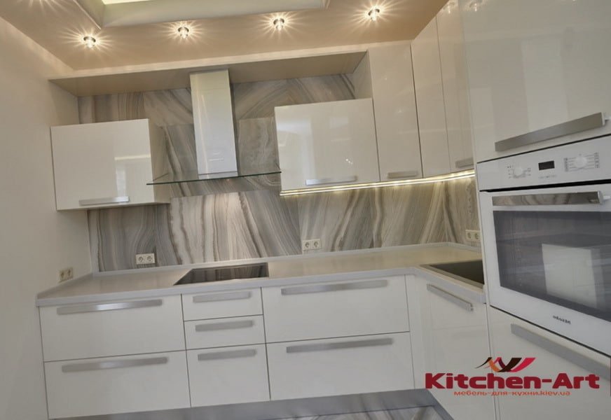 Белый свет не только помогает увидеть истинный цвет приготавливаемой еды, но и хорошо передаёт цветовые оттенки гарнитура. Но его лучше располагать в потолочной части помещения.