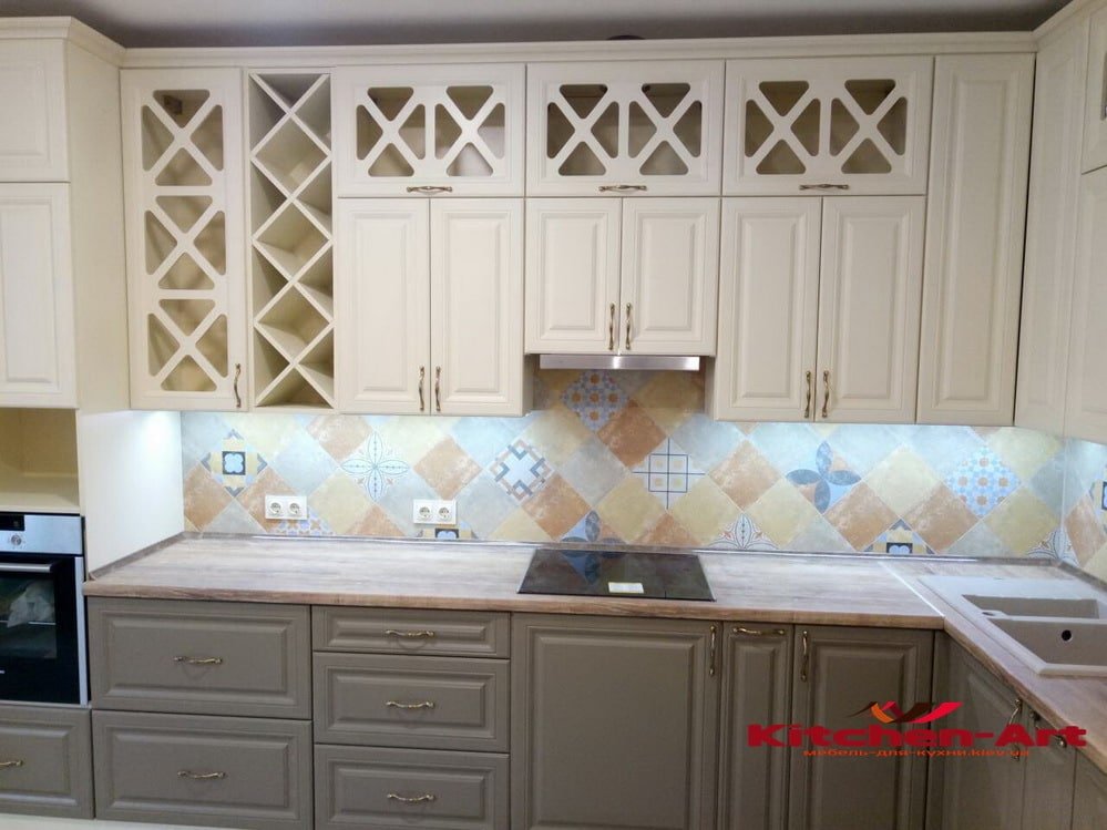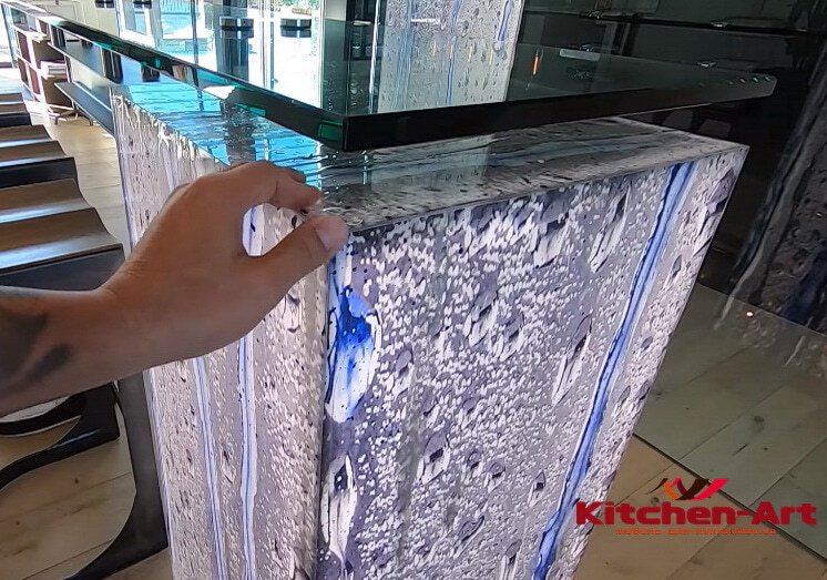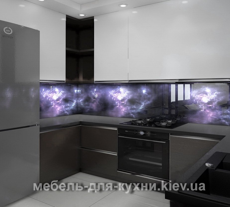 - Настенный фартук, который светится. Задняя часть представлена алюминиевым профилем, передняя – калёным стеклом, при желании украшенным плёночным или нанесенным рисунком. Важно достичь полного сопряжения стеклянных элементов в углах кухни.