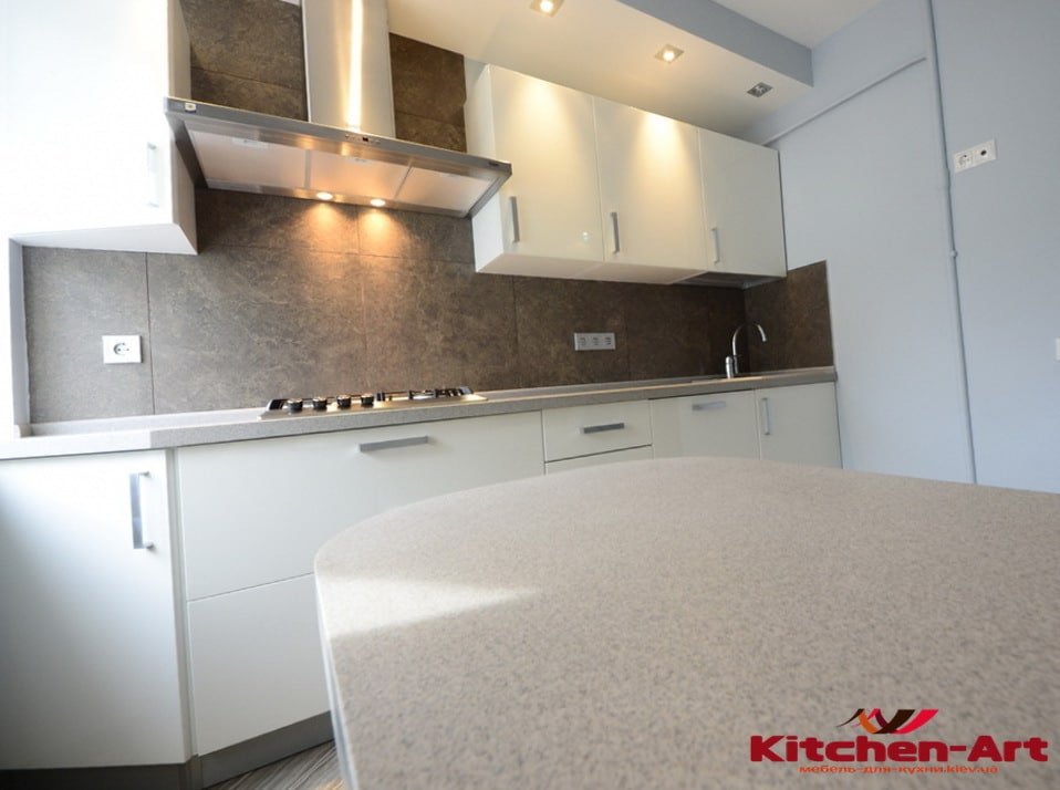 - Потолочное точечное освещение, размещается над верхней границей подвесных шкафов. Не совсем комфортно для кулинарной и гастрономической работы на столешнице.