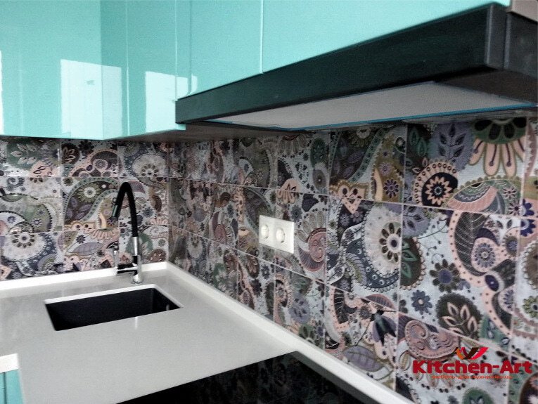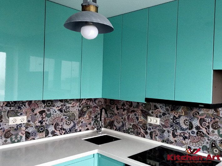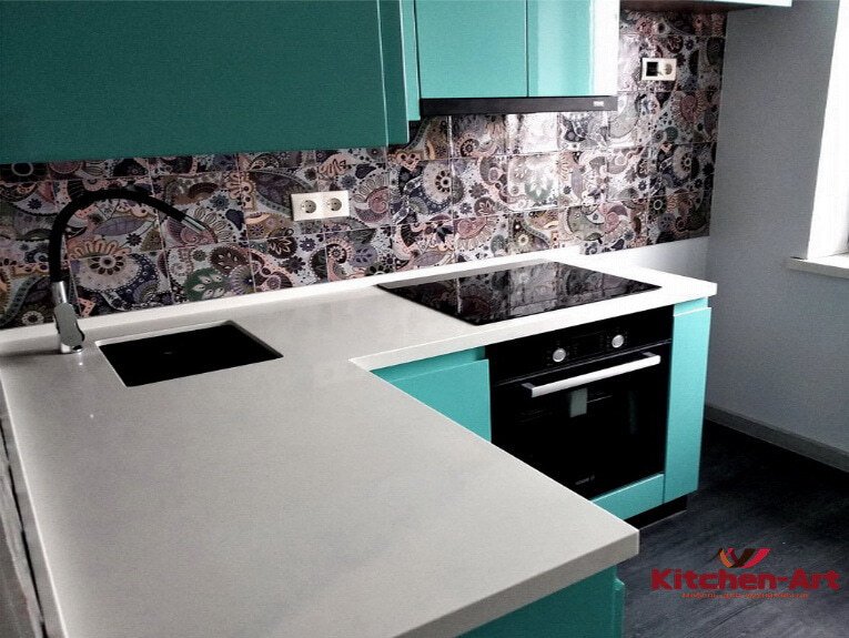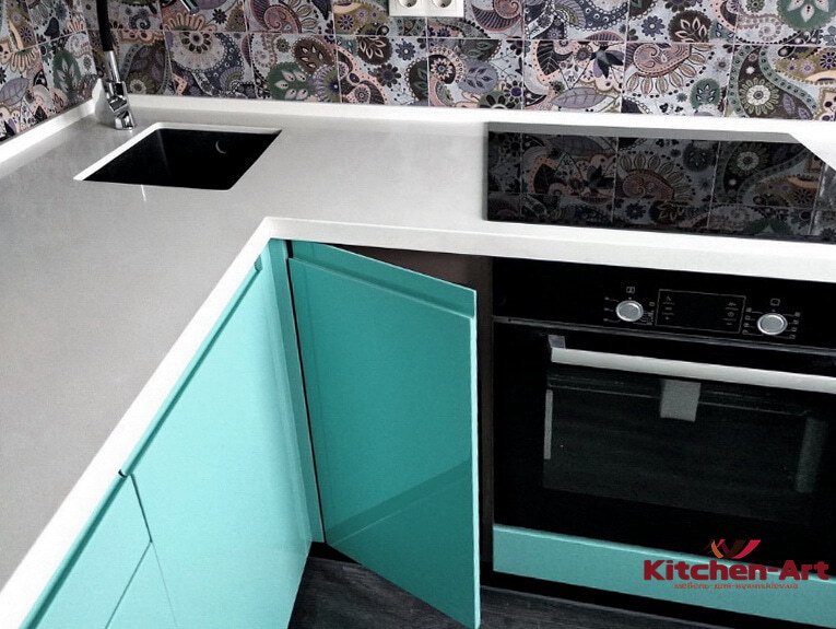 Размер: 1850 мм *1550 мм, Фурнитура: Блюм, Фасады кухни: Крашеный МДФ цвета аквамарин, Столешница: Искуственный камень